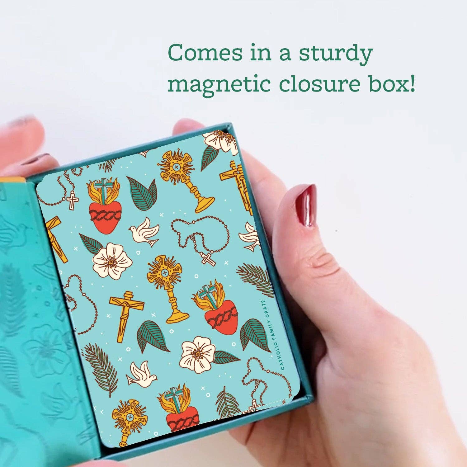 Elevate your game nights with Catholic Playing Cards, a beautifully illustrated deck that brings a touch of faith to your favorite card games. Each card features vibrant, colorfully illustrated portraits of the Holy Spirit, the Holy Family, and the Saints, turning every game into an opportunity to celebrate your faith. The 54 cards come packaged in a sturdy magnetic box for safekeeping.